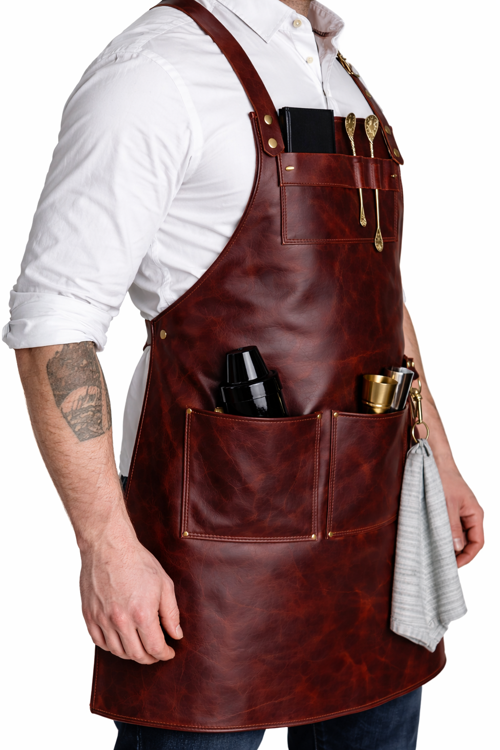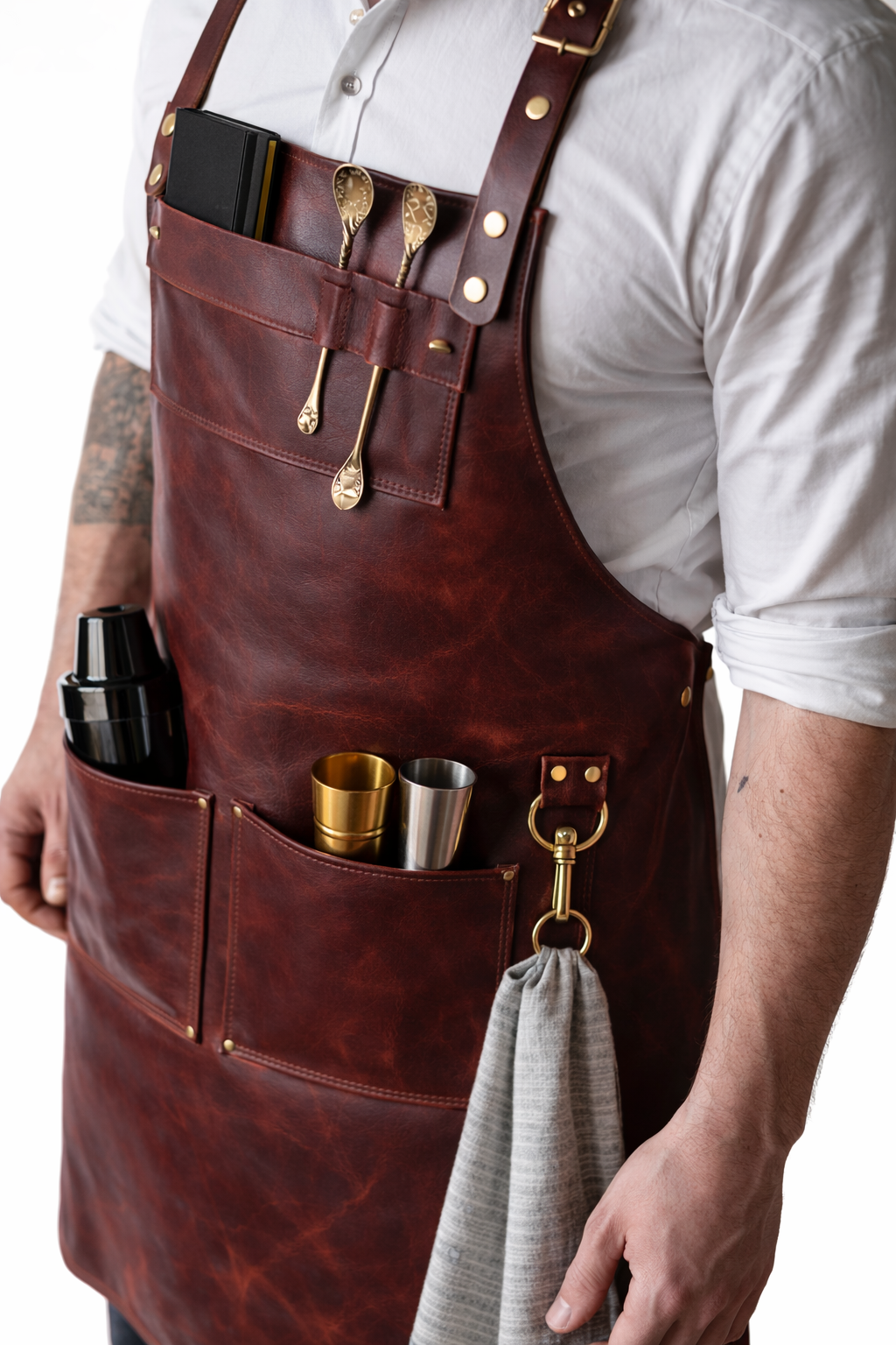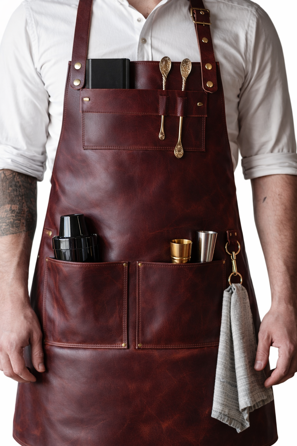 Raise the bar on your barware. The Bordeaux Bartender Leather Apron is designed for professionals who want their workwear to look as good as their cocktails taste. Cut from rich burgundy leather and finished with solid brass hardware, it delivers a premium, confident look behind any bar – from busy cocktail lounges to home speakeasies.