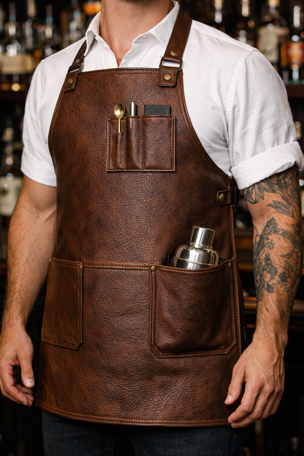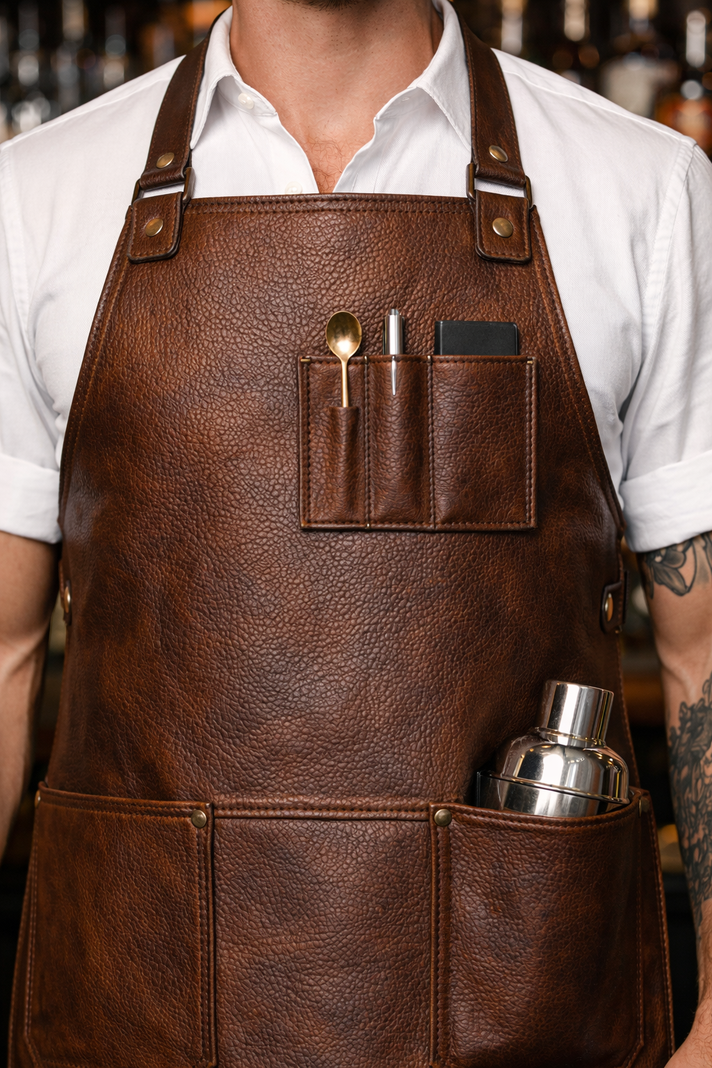 Behind every successful bar station is a bartender managing tools, ingredients, and workflow with precision. The Tobacco Rustic Grain Bar Leather Apron is designed specifically for this environment.